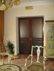схема движения перегородок 10.Раздвижная перегородка из 4-х створок. Две крайние - стационарные, две средние  расходятся в разные сторны, открывая проем на половину его ширины. В открытом положении створки собраны в 2 "пакета" внутри по краям проема. Движение полотен происходит только внутри проема.